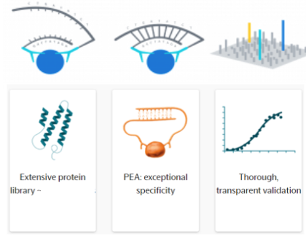 Proximity Extension Assay (PEA) uses matched pairs of antibodies (Abs) attached to unique DNA oligonucleotides. When the correct pair simultaneously binds to a target protein, their DNA oligonucleotides hybridize and serve as a unique template for DNA polymerase-dependent extension. This provides a double-stranded DNA molecule for each detected protein, providing a unique barcode for high-sensitivity, high-specificity readout. Using PEA, these panels can provide accurate quantification below pg/mL levels even in minute samples. PEA is compatible with a wide range of sample types.