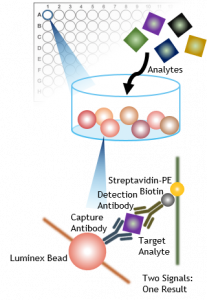 HOC is now providing Immunoassay Multiplex Analysis of protein biomarkers using Luminex® xMAP Technology. Using the MAGPIX® system, we now provide service for analyzing multiplexed cytokines and protein biomarkers in a single assay. Simply bring or send us your samples (sera, urine, supernatant, tissue lysate, etc.) and we will run the assays and give you quantitative data (pg/ml) pertaining to each cytokine or biomarker assayed. The assays use magnetic beads as the capture substrate and have high specificity, sensitivity, and accuracy. They also boast a lower per-analyte cost than a traditional ELISA.